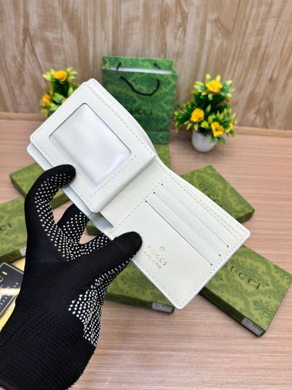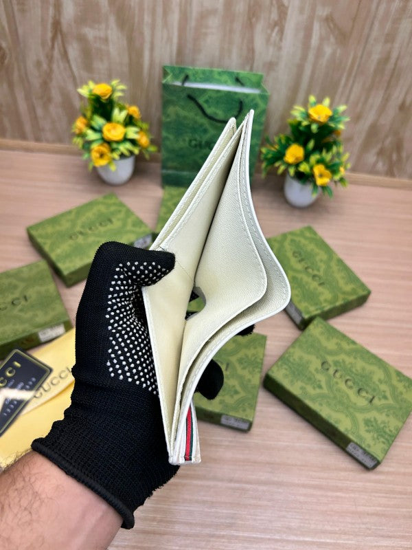 Make a refined fashion statement with the Gucci Beige & White GG Supreme Stripe Wallet. Crafted from the iconic GG Supreme canvas in a light beige tone, this wallet is accentuated with white leather trim and the instantly recognizable green-red-green Web stripe across the front. A polished GG logo emblem in gold completes the elegant look.