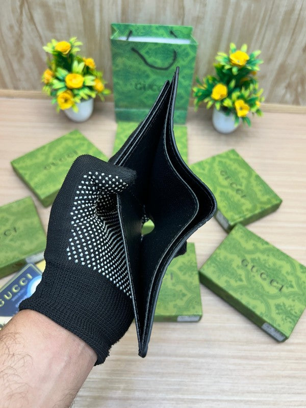 The embossed pattern gives a striking architectural feel while maintaining the elegance expected of Gucci accessories. With a compact bi-fold design, it offers well-organized interior space for cards and cash, all neatly wrapped in authentic Gucci packaging — perfect for collectors or luxury gift-giving.