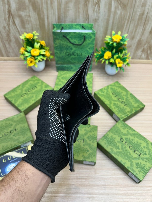 The standout detail is the bold gold GUCCI logo, elegantly placed on the front, reflecting timeless sophistication and unmistakable brand prestige. Ideal for everyday use, this wallet includes organized compartments for cards, bills, and essentials — all while maintaining a slim profile.